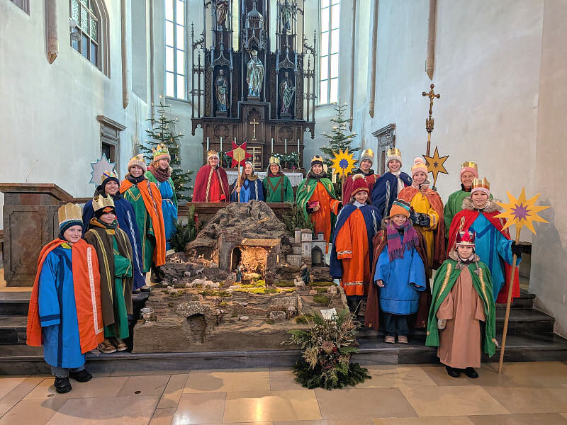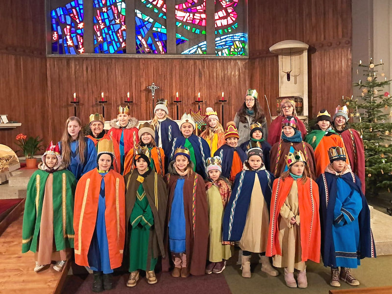 Kinder und Erwachsene, die als Sternsinger unterwegs warten, gestalteten am 6. Jänner 2025 in der Gartenstadtkirche die Sternsingermesse mit.