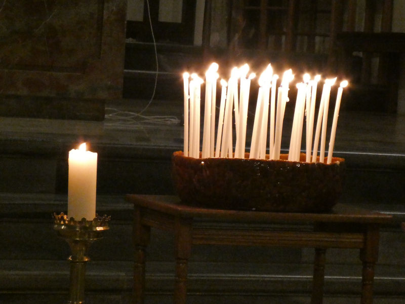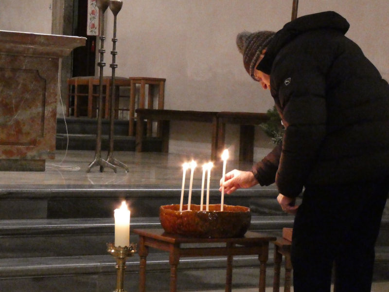 Zu Beginn bat Pfarrer Christian die Mitfeiernden darüber nachzudenken, wann sie in ihrem Leben eine besondere Gnade empfangen haben und wann sie selber zum Licht für andere geworden sind. Alle wurde dann gebeten, eine Kerze vor dem Altar anzuzünden und in einer Schale in den Sand zu stecken.